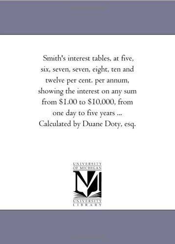 Download Smith's interest tables, at five, six, seven, seven, eight, ten and twelve per cent. per annum, showing the interest on any sum from $1.00 to $10,000, ... five years ... Calculated by Duane Doty, esq. book - Michigan Historical Reprint Series .pdf